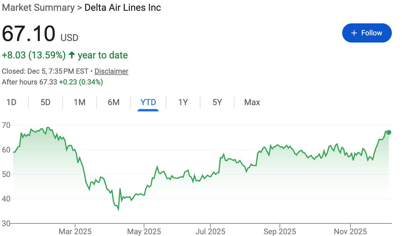 Delta Air Lines $DAL ( ▼ 0.21% ) is the high-flying stock that's been giving investors a reason to smile, or at least a reason to check their portfolios more frequently. Up a respectable 13.59% this year, Delta's stock has been climbing like a plane on takeoff, with most of the boost coming in the past few weeks. It's now flirting with its all-time high.
