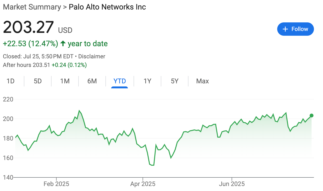 In 2025, the cybersecurity company Palo Alto Networks $PANW ( ▼ 1.05% ) is up 12.47% and hit an all-time high at one point.