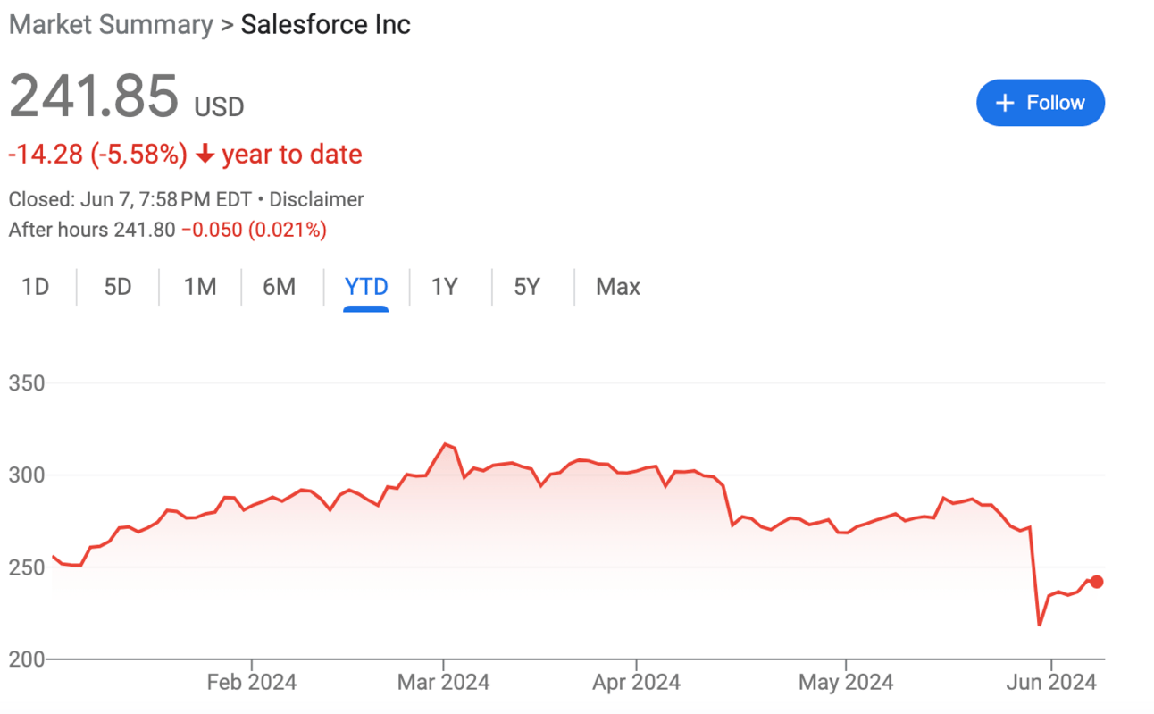 Naturally, this news made many investors panic, and they started selling the stock faster than you can say "Marc Benioff." As a result, Salesforce’s stock is down 12.11% in the last 30 days and has dipped 5.58% this year.